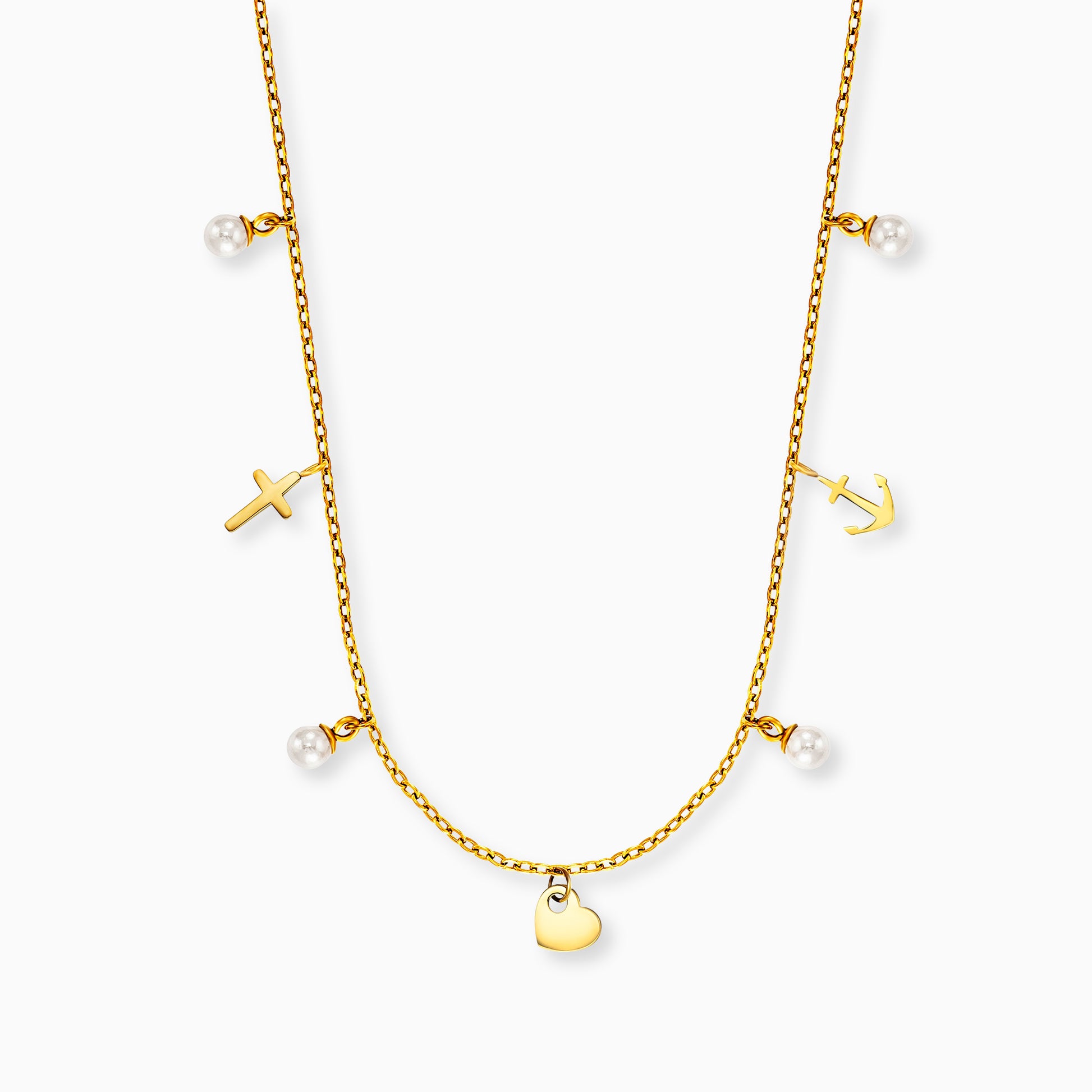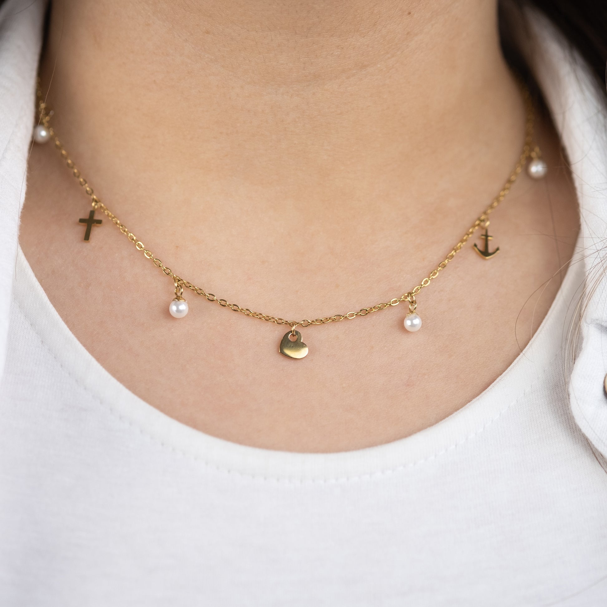 - Goldene Halskette mit Anhänger Kreuz, Herz, Anker und Perlen
