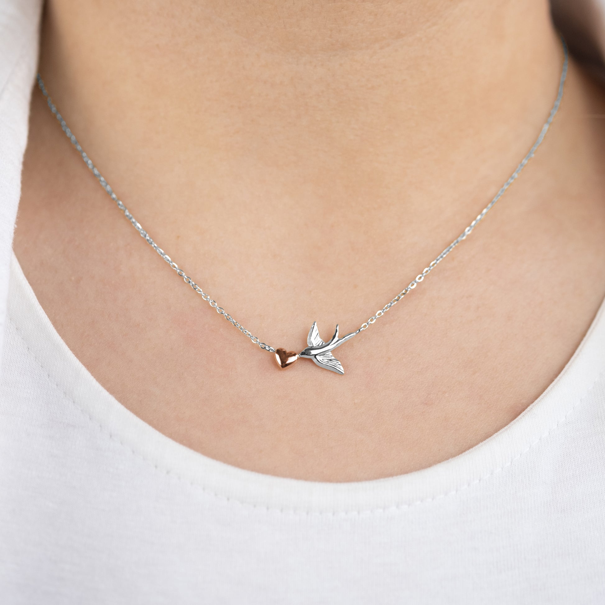 - Zweifarbige Halskette Silber/Roségold Herz und Schwalbe